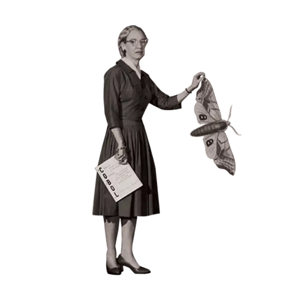Grace Hopper registrou o primeiro “bug” em 1947: um inseto preso no computador. Ela foi pioneira em linguagens de programação e na era digital moderna.